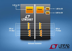 Le LTM2887 est disponible en deux versions d’interface de communications. Le LTM2887-I est compatible avec les interfaces I2C jusqu’à 400kHz, avec des signaux de données série bidirectionnels (SDA) et d’horloge (SCL) et trois signaux de niveau logique CMOS, isolés, supplémentaires, qui fonctionnent jusqu’à 10MHz. Le LTM2887-S est compatible avec une interface SPI et procure un total de six canaux de communication avec isolateur numérique CMOS. Tous les canaux fonctionnent jusqu’à 10MHz et comprennent trois signaux directs (CS, SCK et SDI) et trois signaux inverses (SDO, DO1 et DO2). Pour une configuration de communications à interface SPI, la vitesse d’horloge maximum est de 8MHz pour une communication unidirectionnelle ou de 4MHz pour un fonctionnement aller-retour bidirectionnel.