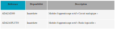 Le module d’apprentissage actif ADALM2000 permet de concevoir et tester des circuits analogiques en temps réel, en utilisant la puissance des équipements de laboratoire traditionnels disponible sur un logiciel d’application graphique. Au-delà d’une approche applicative, le module d’apprentissage actif consacré aux radios logiciels ADALM-PLUTO permet aux étudiants d’acquérir les notions fondamentales des technologies radio logicielles (SDR : Software Defined Radio), radiofréquence (RF) et de communications sans fil tout en expérimentant l’utilisation de canaux de réception et de transmission indépendants qui fonctionnent en full-duplex. Ces approches concrètes de la conception apportent aux étudiants, aux professeurs et aux simples amateurs la liberté et la créativité requises pour élargir le rayon d’action des supports de cours, ainsi que pour explorer différents scénarios de conception en temps réel.