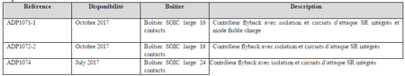Les ADP1071-1 et ADP1071-2 sont des contrôleurs flyback synchrones isolés, tandis que l’ADP1074 est un contrôleur forward synchrone à clamp actif et isolé. L’intégration de plusieurs fonctions telles que la protection contre les surtensions (OVP), le suivi des sorties, le mode à faible charge pour une meilleure efficacité énergétique, ainsi que des drivers pour la rectification synchrone qui requièrent généralement plusieurs composants discrets, permet de réduire de 35 % l’espace occupé sur PCB et d’accroître considérablement la fiabilité du système par rapport aux approches traditionnelles qui utilisent des optocoupleurs. Les nouveaux contrôleurs PWM sont conçus pour les alimentations AC/DC (ADP1071) et DC/DC (ADP1072 et ADP1074) isolées que l’on trouve dans des alimentations universelles, industrielles ou de télécommunications. Autre caractéristique importante, ces contrôleurs incluent une communication au secondaire à l’aide d’un status PGOOD (alimentation correcte) afin d’éliminer les contraintes typiques liées aux barrières d’isolation tout en réduisant le nombre de composants externes utilisés.