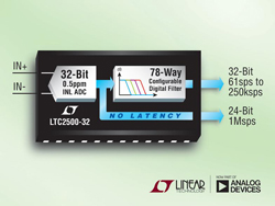 La densité de bruit, remarquablement basse, du LTC2500-32 permet de réaliser une gamme dynamique de 148dB à 61éch./s et de 104dB à 1Méch./s. En plus du bas niveau de bruit, le LTC2500-32 présente une linéarité inégalée de 0,5ppm typique et une INL (linéarité non intégrale) garantie de 2ppm max., une dérive du gain et de la tension de décalage de zéro minime sur les gammes étendues de températures. Ensemble, ces caractéristiques permettent des mesures de pointe, de très grande précision, dans les environnements bruyants, comme les applications de l’automatisation industrielle. Le filtre numérique configurable, intégré, permet sept types de filtres et 13 facteurs de sous-échantillonnage différents, ce qui procure aux utilisateurs une grande souplesse quant aux compromis avec la bande passante, la réponse du filtre et le niveau de bruit pour chaque application.