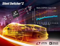Analog Devices, Inc., qui a acquis récemment Linear Technology Corporation, annonce le LT8645S, un régulateur à découpage, abaisseur, synchrone, 8A, pouvant accepter 65V en entrée. Son architecture unique Silent Switcher®2 utilise deux condensateurs internes en entrée ainsi que des condensateurs internes BST et INTVCC pour minimiser la surface des boucles perturbatrices. Combinés avec des fronts de commutation très bien contrôlés et une interne avec plan de masse intégral et l’emploi de colonnettes de cuivre au lieu de plots, le LT8645S réduit les EMI/EMC (émissions dues aux interférences électromagnétiques / à la compatibilité électromagnétique). L’amélioration des performances relatives aux EMI/EMC ne dépend pas de la configuration de la carte, ce qui simplifie la conception et réduit le risque même en utilisant deux couches de circuit imprimé. Le LT8645S satisfait aux limites crêtes des EMI de la norme CISPR 25 Classe 5 de l’automobile, avec une fréquence de découpage de 2MHz, sur toute la plage de la charge. La modulation de fréquence par étalement de spectre est également disponible pour abaisser davantage les niveaux d’EMI/EMC.