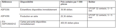 Les nouveaux synthétiseurs ADF5356 et ADF4356 sont spécifiés dans la plage de température comprise entre - 40 et + 85 °C. Ils fonctionnent sous des tensions d’alimentation analogique et numérique nominales de 3,3 V, ainsi qu’à partir de pompes de charge et d’oscillateurs VCO de 5 V, sans oublier leur compatibilité au niveau logique à 1,8 V.