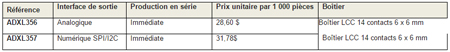 Les accéléromètres 3-axes ADXL356 (sortie analogique) et ADXL357 (sortie numérique) présentent des plages de mesure sélectionnables de ± 10 g, ± 20 g et ± 40 g avec à la clé une flexibilité maximale. Les accéléromètres ADXL356 et ADXL357 affichent par ailleurs une densité de bruit de 80 μg/√Hz à la pointe de l’industrie et une dérive d’offset en température maximale garantie à 0 g de 0,75 mg/°C, ce qui permet de réaliser des applications de haute précision avec un étalonnage minimum. De plus, le boîtier hermétique garantit la conformité du produit final à ses spécifications de répétabilité et de stabilité bien après avoir quitté l’usine. Avec un haut niveau d’intégration dans un format compact, l’accéléromètre faible consommation ADXL357 consomme seulement 200 µA, prolongeant ainsi la durée de vie des applications alimentées par batterie telles que les réseaux sans fil utilisés pour suivre l’état de produits ou d’actifs, les plateformes aéroportées telles que les drones, ou les applications connectées à l’Internet des objets.