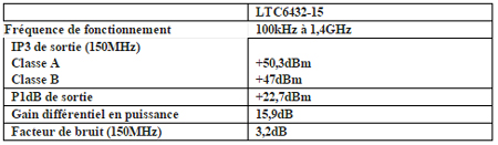 Le LTC6432-15 fonctionne sur une seule alimentation de 5V. Il consomme un courant nominal de 166mA. Le composant est spécifié pour fonctionner avec une température du boîtier de -40°C à 85°C. Le LTC6432-15 est disponible en un boîtier plastique QFN, 4mm x 4mm, en deux versions : la version de classe B, avec tous les paramètres de fonctionnement typiques, au prix unitaire de départ de 3,69$, pour des quantités de 1000 pièces, et la version de classe A, aux performances plus élevées, aux spécifications testées et garanties, au prix unitaire de 6,44$.