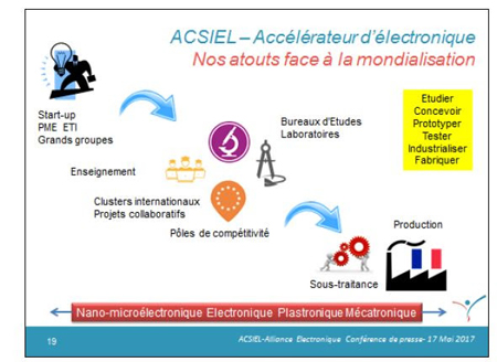 En conclusion, le président de l’Alliance rappelle la richesse des compétences et la forte complémentarité de l’ensemble des acteurs au sein de l’écosystème électronique en France, permettant la mise en oeuvre d’une chaine de valeur complète, accessible aux donneurs d’ordres sur l’ensemble du territoire : recherche, éducation, développement, industrialisation, production de composants, systèmes et équipements.