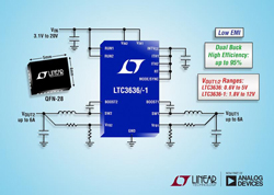 Analog Devices, Inc., qui a acquis récemment Linear Technology Corporation, annonce les LTC3636 et LTC3636-1, des régulateurs à sortie double, abaisseurs, synchrones, 4MHz, de fort rendement, qui comprennent un schéma de contrôle unique en mode courant, à fréquence constante / contrôlée pendant la durée de conduction, avec une fréquence de commutation fixée par boucle à verrouillage de phase. De plus, leur architecture innovante réduit les émissions de conduction et de radiation. Les composants peuvent fournir un courant continu de sortie jusqu’à 6A par canal ou une sortie unique double phase jusqu’à 12A. Les composants peuvent fonctionner à partir de tensions de sortie aussi basses que 0,6V, dans un boîtier compact QFN 4mm x 5mm. La fréquence de commutation est programmable par l’utilisateur, de 500kHz à 4MHz, ce qui permet l’emploi de petits condensateurs et inductances, peu chers, et peut également être synchronisée à un signal d’horloge externe. Le LTC3636/-1 fonctionne à partir d’une tension d’entrée de 3,1V à 20V, alors que les gammes de tensions de sortie s’étendent de 0,6V à 5V pour le LTC3636 et de 1,8V à 12V pour le LTC3636-1, ce qui est approprié aux applications alimentées sur deux éléments de batterie Li-ion ainsi qu’aux systèmes à bus intermédiaires 5V et 12V.