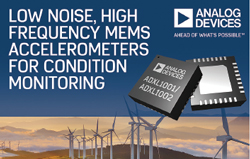 Historiquement, le niveau de bruit élevé des accéléromètres MEMS haute fréquence disponibles, en comparaison avec les technologies existantes, a empêché leur adoption en dépit de la fiabilité, de la qualité et de la répétabilité qui caractérisent la technologie MEMS. Aujourd’hui, les performances en bruit des accéléromètres ADXL1001 et ADXL1002 pour des fréquences élevées correspondent à celles de la technologie céramique piézoélectrique PZT (Plomb, Zirconium, Titane) disponible, ce qui en fait une solution convaincante pour les nouveaux produits de surveillance de l’état opérationnel de machines. Les accéléromètres ADXL1001 et ADXL1002 sont les derniers exemples de la technologie de mesure de précision haute performance conçue par Analog Devices. Ils fournissent des données de haute précision et de haute qualité aux applications connectées à l’Internet des objets industriel et permettent d’obtenir une mesure intelligente à l’autre bout du réseau