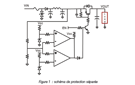 La méthode séparée utilise une diode de puissance en série pour protéger le système des inversions de polarité et courants inverses. Un circuit de 2 A dissipe 1 W d’énergie à travers la diode, ce qui augmentera la température de la carte. Les filtres de circuit (LC) résonants et de multiples diodes Transil contrôlent les transitoires de ligne d’entrée durant les épreuves par impulsions (Commission électrotechnique internationale [CÉI] 61000-4-5).