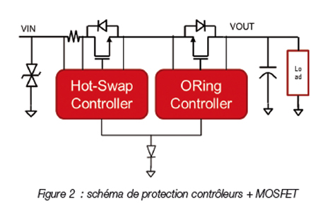 Une autre approche répandue de protection du chemin électrique, présentée dans la figure 2, consiste à utiliser un contrôleur hot-swap et un contrôleur OR. Ce schéma utilise des TEC externes afin de rendre le concept plus efficace et plus fiable. Malheureusement, cette méthode présente encore des difficultés, par exemple pour contrôler les TEC externes, la résistance externe et la mise en oeuvre d’un circuit supplémentaire en vue de la protection d’inversion de la polarité d’entrée. Cette méthode gère difficilement les protections thermique et de SOA (zone de fonctionnement sûr) du fait de l’architecture TEC externe. Même si cette solution est meilleure que la méthode séparée, elle ne convient pas aux systèmes à forte contrainte spatiale tels que les modules entrée/sortie (E/S).