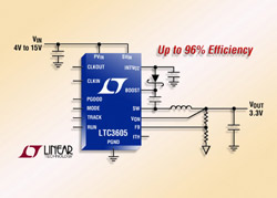 Le LTC3605 utilise des transistors commutateurs internes, à résistances à l’état passant RDS(ON) de seulement 35 mohms et 70 mohms, pour des rendements pouvant atteindre 96%. Sa très faible durée d’état passant lui permet de fonctionner avec un rapport cyclique bas à des fréquences de commutation élevées. Le fonctionnement en mode PolyPhase® du LTC3505 (jusqu’à 12 phases) permet la mise en série de plusieurs régulateurs, fonctionnant en opposition de phase afin de réduire la capacité des condensateurs d’entrée et de sortie. Le fonctionnement à mode courant offre une réponse rapide au transitoire tout en simplifiant la compensation. Les caractéristiques supplémentaires incluent le suivi de la tension de sortie et une consommation à l’arrêt de seulement 15 µA.