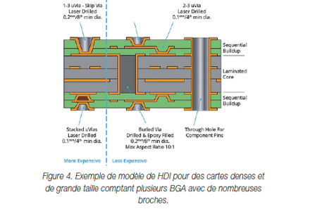 Comme mentionné précédemment, l’autoroutage peut contribuer à optimiser le routage du PCB et à minimiser le nombre de couches. Une autre façon pour avoir plus de densité sur un PCB sans augmenter le nombre de couches consiste à utiliser le HDI - une technique de routage qui utilise des traces très fines et des traversées aveugles, des traversées enterrées et des micro-traversées (Figure 4). S’il est conçu correctement, le HDI peut permettre de réduire les coûts et d’accroître les performances.