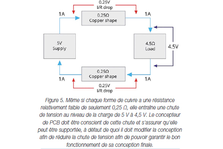 Mais surtout, la rupture du plan de puissance entraîne une réduction de la quantité de cuivre dans le plan d’alimentation, ce qui réduit l’intensité transportée. Pendant la commutation, lorsque le courant est à son maximum, une mauvaise conception peut ne pas être en mesure de fournir suffisamment de courant, ce qui entraîne une chute de tension (également appelée DC drop ou IR drop) au niveau du circuit imprimé (Figure 5). Une tension insuffisante entraînera des dysfonctionnements qui, dans certains cas (comme dans les applications automobiles qui contrôlent la transmission, le moteur ou les fonctions de freinage) peuvent s’avérer catastrophiques. Pour compliquer les choses, ces chutes de tension sont souvent intermittentes et se produisent uniquement dans certaines conditions de commutation. Cela les rend difficiles à tester ou à diagnostiquer par des techniques manuelles.
