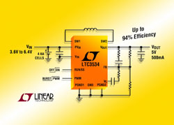 Une application typique est celle utilisant une batterie d’accumulateurs alcalins avec une gamme de tensions d’entrée, de 3,6 V à 6,4 V, pour alimenter un rail de sortie de 5 V. Dans la plupart des cas, ce convertisseur DC / DC, abaisseur-élévateur peut accroître l’autonomie sur batterie de 25% par rapport à une réalisation SEPIC traditionnelle. La fréquence de découpage fixe de 1 MHz du LTC3534 assure un bruit de faible niveau tout en permettant de réduire la taille des composants externes. La combinaison des petits composants externes et d’un boîtier DFN, 3 mm x 5 mm (ou SSOP-16), conduit à une solution de petite empreinte, typiquement requise dans les applications portables.