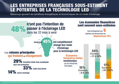 Seules 10% des entreprises interrogées prévoient de passer aux LED au cours des 12 prochains mois. Les économies financières résultant du passage à la LED sont souvent sous-estimées. Une entreprise sur 5 estime que les LED permettent d’économiser au maximum 10% du montant de la facture d’électricité.