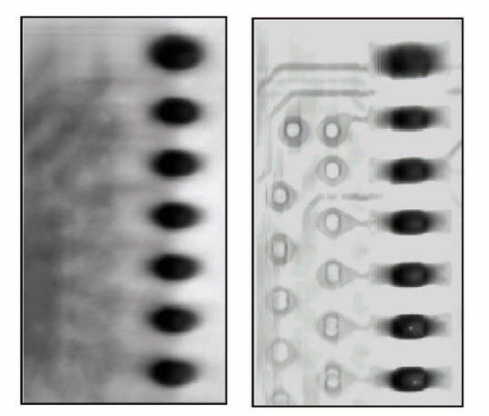 Les premiers systèmes seront commercialisés début 2007. La figure 8 montre un exemple des résultats de mesures effectuées par tomosynthèse optimisée. La même région que celle illustrée à la figure 1 a été examinée, et un ensemble de données 3D a été généré. Les faces avant et arrière de la carte ont ensuite été extraites de ces données. L’optimisation de la qualité et les avantages inhérents à cette technique apparaissent de façon évidente.