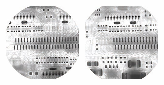 Cela a conduit à une renaissance des stratégies de contrôle radiographique, qui ont bien sûr été adaptées aux besoins actuels. L’une des limitations principales des systèmes de contrôle radiographique 2D classiques, qui irradient simplement un objet pour en produire une radiographie, tient au fait que les composants implantés sur les deux faces d’une carte électroniques apparaissent en superposition sur l’image. Cela nuit à la qualité des tests des cartes double face et en limite la profondeur (figure 1).