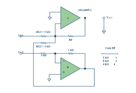 Le circuit peut convertir une entrée différentielle en une sortie asymétrique avec un gain ajustable. Le gain du système peut être fixé par le rapport entre RF et RG1 en supposant que RG2 = RG1, et que le gain de l’amplificateur B est de –1.