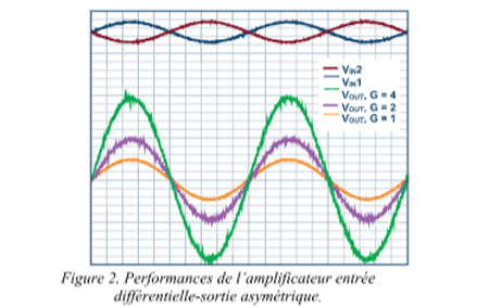 Les courbes en Figure 2 ont été enregistrées en appliquant une tension d’entrée différentielle et en faisant varier le gain du circuit. La valeur de RF définit le gain du système. Comme on peut le constater, les courbes correspondent à des gains de 1, 2 et 4 pour une tension d’entrée différentielle de 1 Vpp et 1 kHz.