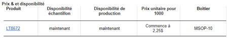 Le LT8672EMS est encapsulé en un boîtier MSOP-10. Une version pour températures industrielles, le LT8672IMS, est testée et garantie pour fonctionner avec une température de jonction de -40°C à 125°C. La version LT8672HMS est testée et garantie pour fonctionner avec une température de jonction de -40°C à 150°C.