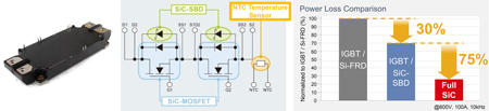 Le module d’alimentation SiC utilisé dans l’onduleur de la voiture de course de l’équipe VENTURI Formula E Team fournit un excellent rendement électrique, grâce au développement d’un nouvel ensemble avec une meilleure structure interne du module et à l’optimisation de la gestion thermique. Par rapport aux modules IGBT conventionnels avec des courants similaires, ce module permet de réduire les pertes de commutation de 75% (à une température de puce de 150°C). Cela permet une meilleure efficacité de l’énergie pour l’ensemble de l’application. De même, les composants périphériques plus compacts sur tout l’entraînement haute fréquence et les effets des réductions de pertes de commutation permettent d’obtenir un système de refroidissement plus compact.
