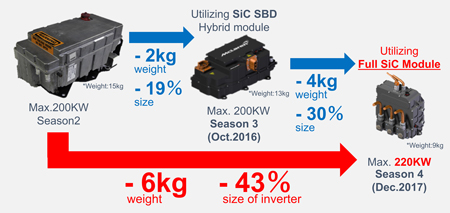 L’utilisation du module d’alimentation full SiC dans la section de l’onduleur (cœur du groupe motopropulseur) permet de réduire la taille de l’onduleur de 43% et son poids de 6 kg par rapport à la saison 2. Il est même plus petit de 30% et plus léger de 4 kg par rapport à l’onduleur de la saison 3.