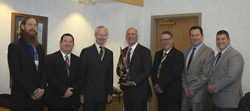 Légende de la photo : Président de Harwin, Damon De Laszlo (troisième à partir de la gauche) offre à Dave Doherty, Directeur d’exploitation, Digi-Key (quatrième à partir de la gauche) son prix de distributeur mondial de l’année.