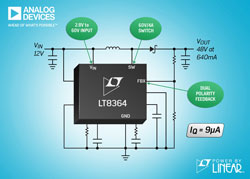 Le LT8364 peut être configuré en convertisseur Boost, SEPIC ou Inverseur. Sa fréquence de commutation peut être programmée de 300kHz à 2MHz, ce qui permet aux concepteurs de réduire la taille des composants externes et d’éviter les bandes de fréquences sensibles, comme la bande radio AM. De plus, il présente un rendement à 2MHz supérieur à 90%. Le fonctionnement en Burst Mode® réduit le courant de repos à seulement 9µA et maintient le niveau d’ondulation de la tension de sortie inférieur à 15mVcrête-à-crête. La combinaison d’un petit boîtier DFN, 4mm x 3mm, ou MSOP-16E pour tension élevée, et de petits composants externes assure une empreinte très compacte et réduit le coût de la solution.