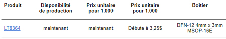Le LT8364EDE est disponible en un boîtier DFN-12, 4mm x 3mm, et le LT8364EMSE est disponible en boîtier pour forte tension, MSOP-16E (4 broches supprimées pour un espacement pour tension élevée). Les versions pour températures industrielles (-40°C à 125°C) (le LT8364IDE et le LT8364IMSE), et les versions haute température (-40°C à 150°C) (le LT8364HDE et le LT8364HMSE) sont aussi disponibles.