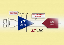 Linear Technology présente le LTC6416, un amplificateur différentiel tampon, de gain unité, large bande, 2 GHz, conçu pour répondre au défi de piloter des CAN de haute résolution. Le LTC6416 offre d’excellentes performances quant à la figure de bruit et la distorsion aux fréquences élevées. Avec ses broches de programmation de la tension de sortie, le LTC6416 limite l’excursion de tension en sortie appliquée au CAN et évite à ce dernier un recouvrement de surtension.