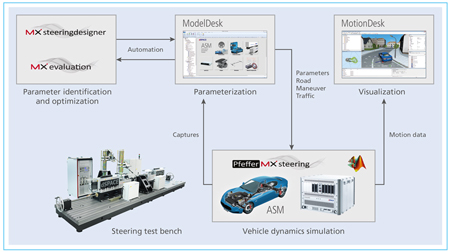 Les outils établis MXsteeringdesigner et MXevaluation ainsi que l’expertise MdynamiX sont désormais accessibles sur les plates-formes dSPACE. Les étapes de travail fondamentales, telles que la caractérisation du système de direction et l’optimisation des paramètres des modèles de direction, peuvent ainsi être considérablement simplifiées. Par exemple, MXsteeringdesigner peut transférer automatiquement les paramètres d’un modèle de système de direction d’un banc d’essais de direction dSPACE vers ModelDesk de dSPACE. Avec MXevaluation, il est possible de déterminer des paramètres objectifs à partir des mesures de données du véhicule et de simulations et ainsi de les utiliser pour la calibration des calculateurs ou pour l’optimisation de la sensation de conduite.