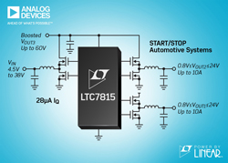 Analog Devices annonce le Power by Linear™ LTC7815, un contrôleur DC/DC, synchrone, à trois sorties (abaisseur, abaisseur, élévateur), haute fréquence (jusqu’à 2.25MHz), qui maintient toutes les tensions de sortie régulées dans les conditions d’un démarrage à froid d’un véhicule. La tension d’une batterie 12V peut tomber à moins de 4 volts en cas de redémarrage ou démarrage à froid, provoquant la réinitialisation des systèmes d’info-divertissement et autres systèmes électroniques qui fonctionnent de 5 volts à plus. Le convertisseur élévateur synchrone, de rendement élevé, alimente les deux convertisseurs abaisseurs, ce qui évite la chute de tension de sortie lorsque la tension de la batterie chute, une caractéristique utile pour les systèmes de démarrage/arrêt de l’automobile qui coupent le moteur à l’arrêt pour économiser du carburant. Parallèlement, les contrôleurs abaisseurs peuvent être alimentés à partir de l’entrée pour un contrôleur à sortie triple polyvalent.