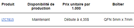 Le LTC7815 est disponible en un boîtier QFN de 38 broches, 5mm x 7mm. Deux classes de températures sont disponibles, pour un fonctionnement de –40 à 125°C, pour les classes de températures industrielles et plus étendues, et de –40°C à 150°C, pour la classe haute température pour l’automobile.