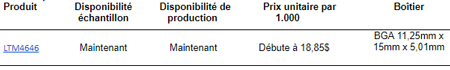 Autonome, le LTM4646 fonctionne sur une plage de la tension d’entrée de 4,5V à 20V. Lorsqu’une tension de polarisation externe de 5V est disponible, le composant peut fonctionner à partir de 2,375V. Les tensions de sortie peuvent être réglées entre 0,6V et 5,5V, ce qui permet au composant de générer, non seulement une basse tension pour les composants numériques, mais aussi 2,5V, 3,3V et 5V, qui sont généralement requises pour les tensions de bus des systèmes. La fréquence de commutation peut être programmée, par une seule résistance, sur la plage de 250kHz à 1,3MHz, et peut être également synchronisée à une horloge externe de 300kHz à 1MHz, pour les applications sensibles au bruit. En plus, il comprend une protection contre les surtensions et les surintensités. Le LTM4646 fonctionne de -40°C à 125°C.