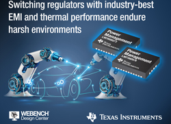 Les régulateurs Buck 3,5 à 36 V LM73605/6 et 3,5 à 60 V LM76002/3 surpassent les exigences élevées de CEM de la norme CISPR 25 classe 5 pour les applications automobiles. La fréquence de commutation de sortie programmable de ces régulateurs peut être réglée à une valeur supérieure à la moyenne fréquence, ce qui évite les interférences en moyenne fréquence et réduit l’encombrement et le coût du filtre de sortie, ou à une valeur inférieure à la moyenne fréquence afin d’optimiser le rendement.