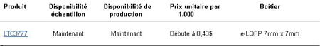 Le LTC3777 est disponible en un boîtier e-LQFP de 48 broches, à espacement de broches pour un fonctionnement à tension élevée. Les versions de classe de températures industrielles et plus étendues, de –40°C à 125°C sont disponibles.