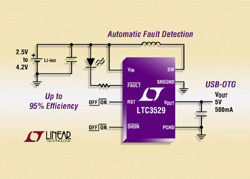 Linear Technology Corporation annonce le LTC3529, un convertisseur DC / DC, élévateur, synchrone, 1,5 MHz, mode courant, avec détection automatique d’erreur de surcharge. Le circuit de protection spécifique USB OTG (On-The-Go : transmission point à point) du composant possède un drapeau d’erreur qui peut être programmé soit au verrouillage arrêt soit au redémarrage après une durée de temps mort quand le bus est surchargé. Les commutateurs internes, de 1,5 A, du LTC3529 peuvent fournir un courant continu en sortie jusqu’à 500 mA, à une tension fixe de 5 V, sur un seul élément de batterie Li-ion. Une gamme de tensions d’entrée, de 1,8 V à 5,25 V, rend le LTC3529 idéal pour les applications alimentées sur batterie Li-ion / polymère ou plusieurs éléments de batterie NiCd / NiMH / alcaline.