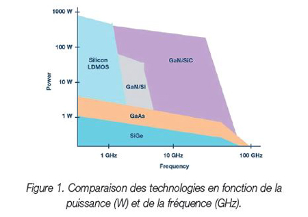 Ces dernières années, les amplificateurs à tubes à ondes progressives (TWT) ont dominé l’électronique de forte puissance en étant utilisés comme étage d’amplification en sortie sur de nombreux systèmes. Cette technologie affiche de solides atouts, parmi lesquels une puissance pouvant atteindre plusieurs kW, un fonctionnement sur une, voire plusieurs octaves de bande passante, une haute efficacité en régime linéaire et une bonne stabilité en température. Parmi leurs inconvénients, citons une fiabilité médiocre à long terme, un faible rendement et une tension opérationnelle qui doit être très élevée — de l’ordre d’1 kV, parfois davantage. Compte tenu de leur fiabilité à long terme, les circuits intégrés à semiconducteurs suscitent un vif engouement depuis quelques années, à commencer par les composants en arséniure de gallium (AsGa). Dans la mesure du possible, de nombreux ingénieurs système combinent plusieurs circuits intégrés en AsGa pour délivrer une puissance de sortie élevée. Des entreprises entières doivent leur succès à la combinaison fructueuse de technologies. On dénombre plusieurs façons de combiner des technologies, telles que la combinaison spatiale, par groupe, etc. Mais ces méthodes souffrent du même problème de pertes et les concepteurs doivent éviter d’y recourir. Cette situation nous incite à utiliser des composants de forte puissance pour commencer un nouveau projet. Pour doper la puissance RF d’un amplificateur de puissance, la solution la plus simple consiste à augmenter la tension, ce qui rend les transistors au nitrure de gallium (GaN) particulièrement attrayants. La comparaison des différentes technologies de fabrication de semiconducteurs montre comment la puissance augmente généralement avec la tension de fonctionnement de la technologie microélectronique employée. La filière silicium-germanium (SiGe) utilise une tension de fonctionnement relativement basse (de 2 à 3 V), mais ses atouts en matière d’intégration en font une option très intéressante. Pendant de nombreuses années, l’AsGa a été largement utilisé pour les amplificateurs de puissance hyperfréquences avec des tensions de fonctionnement comprises entre 5 et 7 V. La technologie LDMOS silicium fonctionnant sous 28 V a longtemps fait les beaux jours de l’industrie des télécommunications, mais elle est essentiellement performante en dessous de 4 GHz, ce qui l’écarte des applications à large bande. L’émergence de la technologie GaN opérant entre 28 et 50 V sur un substrat à faibles pertes et haute conductivité thermique comme le carbure de silicium (SiC) a ouvert de nouvelles opportunités. Aujourd’hui, la technologie GaN sur substrat en silicium fonctionne uniquement au-dessous de 6 GHz. Les pertes RF associées au substrat et sa conductivité thermique inférieure à celle du carbure de silicium compromettent le gain, le rendement et la consommation lorsque la fréquence augmente. La Figure 1 compare les différentes technologies de semiconducteurs.