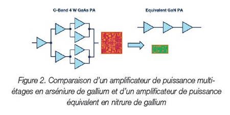 C’est dans ce contexte que le nitrure de gallium devient très utile, car il permet de passer rapidement à une tension d’alimentation de 28 V au lieu de 5 V avec l’AsGa, la puissance atteignable passant pour sa part de 0,25 à presque 8 W par simple migration vers la technologie GaN. D’autres considérations entrent en ligne de compte, à savoir la longueur des grilles dans la filière disponible en nitrure de gallium, ainsi que la possibilité d’atteindre le gain requis à l’extrémité élevée de la bande de fréquence. Avec le temps, les filières en nitrure de gallium disponibles sur le marché sont de plus en plus nombreuses.