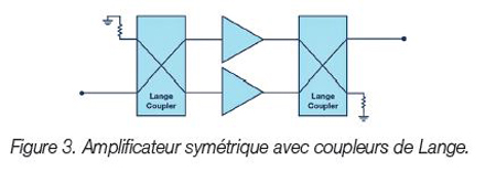 Pour réaliser un projet à large bande passante, l’une des possibilités consiste à mettre en oeuvre une conception équilibrée avec des coupleurs de Lange au niveau de l’entrée et de la sortie RF, comme le montre la Figure 3. Dans ce cas, les pertes par réflexion dépendent en fait de la conception du coupleur, dans la mesure où il est plus simple d’optimiser la réponse en gain et en puissance dans la plage de fréquence sans qu’il soit nécessaire d’optimiser les pertes par réflexion. Même avec des coupleurs de Lange, il devient plus difficile d’obtenir des largeurs de bande sur une octave, mais les pertes par réflexion sont intéressantes pour ce type de conception.
