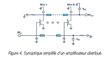 Les amplificateurs de puissance distribués représentés en Figure 4 méritent également d’être étudiés. Ce type d’amplificateur de puissance donne toute sa mesure en incorporant les effets parasites des transistors dans les réseaux d’adaptation (matching networks) entre les composants. Les capacités d’entrée et de sortie de l’appareil peuvent être associées combinées avec respectivement l’inductance des lignes de grille et de drain afin de rendre les lignes de transmission virtuellement transparentes, à l’exclusion des pertes sur la ligne de transmission.