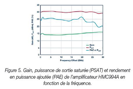 Examinons l’amplificateur de puissance distribué réalisé en AsGa et fonctionnant du continu à 30 GHz proposé par Analog Devices sous la référence HMC994A. Ce composant est intéressant, car il couvre plusieurs décades de bande passante, un large éventail d’applications, et peut atteindre un haut niveau de puissance et d’efficacité. Le rendement est illustré en Figure 5. Cette illustration représente une puissance de sortie saturée du MHz à 30 GHz avec une puissance de plus d’1 W et un rendement en puissance ajoutée (PAE) nominal de 25 %. Cette référence présente également de solides performances en interception du troisième ordre (IP3), à savoir 38 dBm (nominal). De tels résultats montrent que des conceptions en AsGa permettent d’atteindre un rendement proche de ce qu’autorisent de nombreux types d’amplificateurs de puissance en bande étroite. Compte tenu de la pente de gain qui devient positive avec la fréquence, du rendement en puissance ajoutée (PAE) élevé, des performances de puissance en large bande et de faibles pertes de désadaptation, le HMC994A représente un produit intéressant.