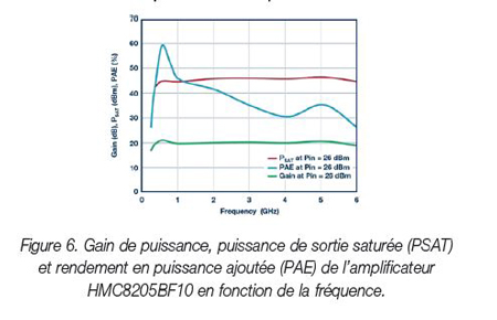 circuit intégré peut délivrer environ 10 fois plus de puissance que des solutions comparables en arséniure de gallium. Ces dernières années, un système complexe combinant des circuits en AsGa aurait été nécessaire, sans pour autant atteindre un rendement comparable. Ce composant montre ce que permet d’obtenir la technologie GaN en couvrant des bandes passantes étendues et en offrant une puissance et un rendement élevés (voir Figure 6). Monté en boîtier à fixation par brides capable de supporter les signaux à ondes entretenues (CW) qui caractérisent de nombreuses applications militaires, le HMC8205BF10 témoigne par ailleurs des progrès accomplis dans le domaine du conditionnement de circuits électroniques de haute puissance.