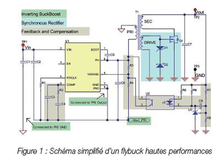 La figure 1 montre un schéma simplifié de flybuck inverseur avec photocoupleur et redressement synchrone secondaire.