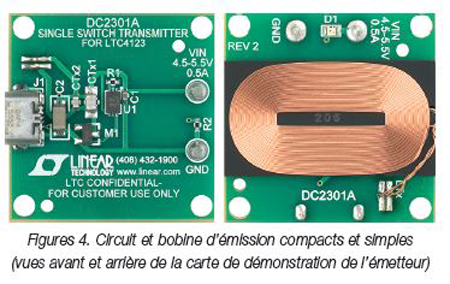 Un système d’alimentation sans fil inductif comporte un circuit électronique d’émetteur, une bobine d’émission, un circuit électronique de récepteur et une bobine de réception. Le circuit LTC4123 constitue la base du système électronique de récepteur d’un tel système. La bobine de réception est intégrée sur le circuit imprimé (PCB) du circuit électronique de récepteur. Une cellule LC résonante externe reliée à la broche ACIN permet aux composants de recevoir l’énergie sans fil à partir du champ magnétique alternatif produit par une bobine d’émission. Un oscillateur au silicium à commande par tension TimerBlox LTC6990 peut être utilisé comme émetteur, comme l’indique la fiche technique LTC4123. Voir la figure 2 pour un exemple de schéma d’application. Voir les figures 3, 4 et 5 qui montrent des cartes de démonstration de récepteur/chargeur et émetteur illustrant la solution miniaturisée.