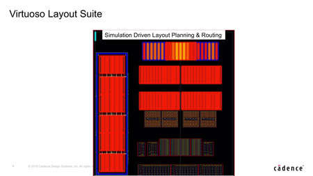 L’environnement Virtuoso Layout évolue d’une configuration de validation électrique (« electrically aware ») vers la première solution de layout pilotée électriquement et par la simulation du marché en utilisant des ensembles uniques de technologies « in-design » pour assurer l’intégrité et optimiser les performances des circuits en cours de conception. Cette nouvelle solution de layout pilotée par la simulation permet de résoudre nombre des problèmes d’électromigration (EM) et d’effets parasites qui pénalisent les circuits critiques et les conceptions en nœuds technologiques avancés. Pour accroître l’automatisation du layout, le nouvel environnement s’enrichit de techniques révolutionnaires de planification et de floorplanning hiérarchique, ainsi que de nouvelles technologies d’automatisation du placement-routage dans le but d’augmenter la productivité et le débit de conception du layout, tout en raccourcissant les délais d’exécution du layout.