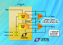 La programmation par logiciel permet de se passer des résistances de précision chères, des étages de gain et de la commutation manuelle par cavalier. Le LT2753-16 présente d’excellentes performances en continu, avec une INL et une DNL de ±1 LSB (max.), sur la gamme de températures industrielles de -40°C à + 85°C. Fonctionnant sur une alimentation simple, de 2,7 V à 5,5 V, ce CNA a une consommation à l’arrêt inférieure à 1 µA. Les six gammes de tensions de sortie,programmables par le logiciel SoftSpan, incluent deux gammes de tensions de sortie unipolaires (0 V à 5 V ou 0 V à 10 V), et quatre gammes de tensions de sortie bipolaires (± 10 V, ± 5 V ± 2,5 V, – 2,5 V à + 7,5 V). La possibilité de programmation par logiciel, sa faibleconsommation et sa précision en continu, font que le LTC2753-16 est idéal pour les modules d’acquisition de données ATE
