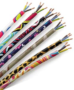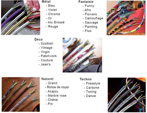 Pour les industriels, il est donc aujourd’hui possible de disposer de 5 familles de motifs de câbles décorés (métal, naturel, techno, fantaisie, déco) soit 29 motifs différents dans des styles scottish, à fleurs, fluo, acajou, ronce de noyer, or, chrome… Le décor sur câble permet pour la première fois de l’intégrer dans l’univers de l’objet et d’en faire un élément à part entière de son design. Exemples : un baladeur pour enfant peut être alimenté en électricité par un câble fantaisie type painting, un luminaire contemporain peut s’offrir un câble métal violet, un lecteur MP3 à tout à gagner avec un câble techno free style ou le micro d’un chanteur avec un câble techno dance…