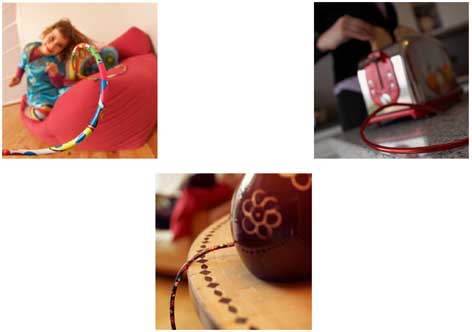 Par son aspect fantaisie, design et brillant, le câble quitte sa seule utilisation fonctionnelle et donne à l’objet un supplément d’âme et de design. Le câble devient ainsi une matière noble, un composant de décor à part entière de l’objet qu’il alimente en électricité.