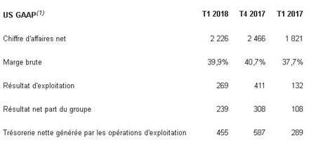 Le résultat net du premier trimestre ressort à 239 millions de dollars, ou 0,26 dollar par action diluée, contre 308 millions de dollars au quatrième trimestre 2017, ou 0,34 dollar par action, et enregistre une hausse significative par rapport au résultat net de 108 millions de dollars (ou 0,12 dollar par action diluée) enregistré au premier trimestre 2017.