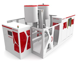 L’imprimante est équipée d’un système d’alimentation et de recharge automatique qui lui permet d’imprimer en continu sur un plateau introduit par un bras robotisé. Après l’impression 3D des pièces en céramique, il est transféré dans une première cabine d’aspiration pour enlever l’excèdent de pâte non polymérisée avant d’entrer dans une cabine de nettoyage automatisée. Les pièces sont par la suite mises à la disposition d’un opérateur pour un contrôle et un dernier nettoyage, si nécessaire, avant de les déposer un plateau réfractaire. Le bras reprend ce plateau pour l’apporter à un four réversible à double cloche, pour le plus performant, qui assure le déliantage et de frittage sans avoir besoin de refroidir le produit entre les deux. Il permet de réduire les opérations thermiques à 34h, contre 120h pour des fours traditionnels. Cette ligne permet d’optimiser le temps d’utilisation de l’imprimante, de gagner du temps sur le process global et de minimiser les déchets tout en produisant à haute cadence. Elle est évolutive pour accueillir deux imprimantes et/ou deux fours.